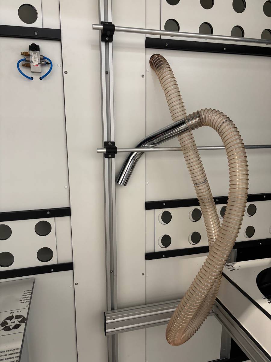 Le caisson insonorisé est installé en local technique, à proximité immédiate de la sorbonne et du poste utilisateur. Il protège le groupe moteur-ventilateur, raccordé au réseau d’aspiration centralisée du laboratoire. L’ensemble est monté sur silentblocs pour limiter la transmission vibratoire.